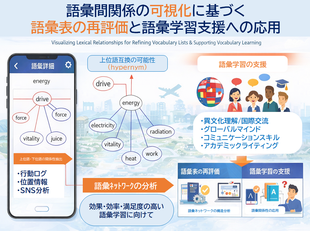 語彙間関係の可視化に基づく語彙表の再評価と語彙学習支援への応用,海外留学における学生行動の可視化と国際性・異文化対応力の育成