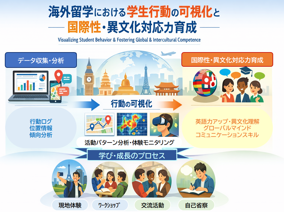 海外留学や短期研修における学生の行動データを収集・可視化し、国際性や異文化対応力の育成プロセスを科学的に解明することを目的とする。スマートフォン利用ログや学習行動の記録、現地での交流活動の分析を通じて、学習者がどのように環境へ適応し、語彙習得や異文化理解を深めていくのかを明らかにする。得られた知見を基に、国際教育プログラムの改善や地域社会との連携を含む教育マネジメントへ応用する研究である。