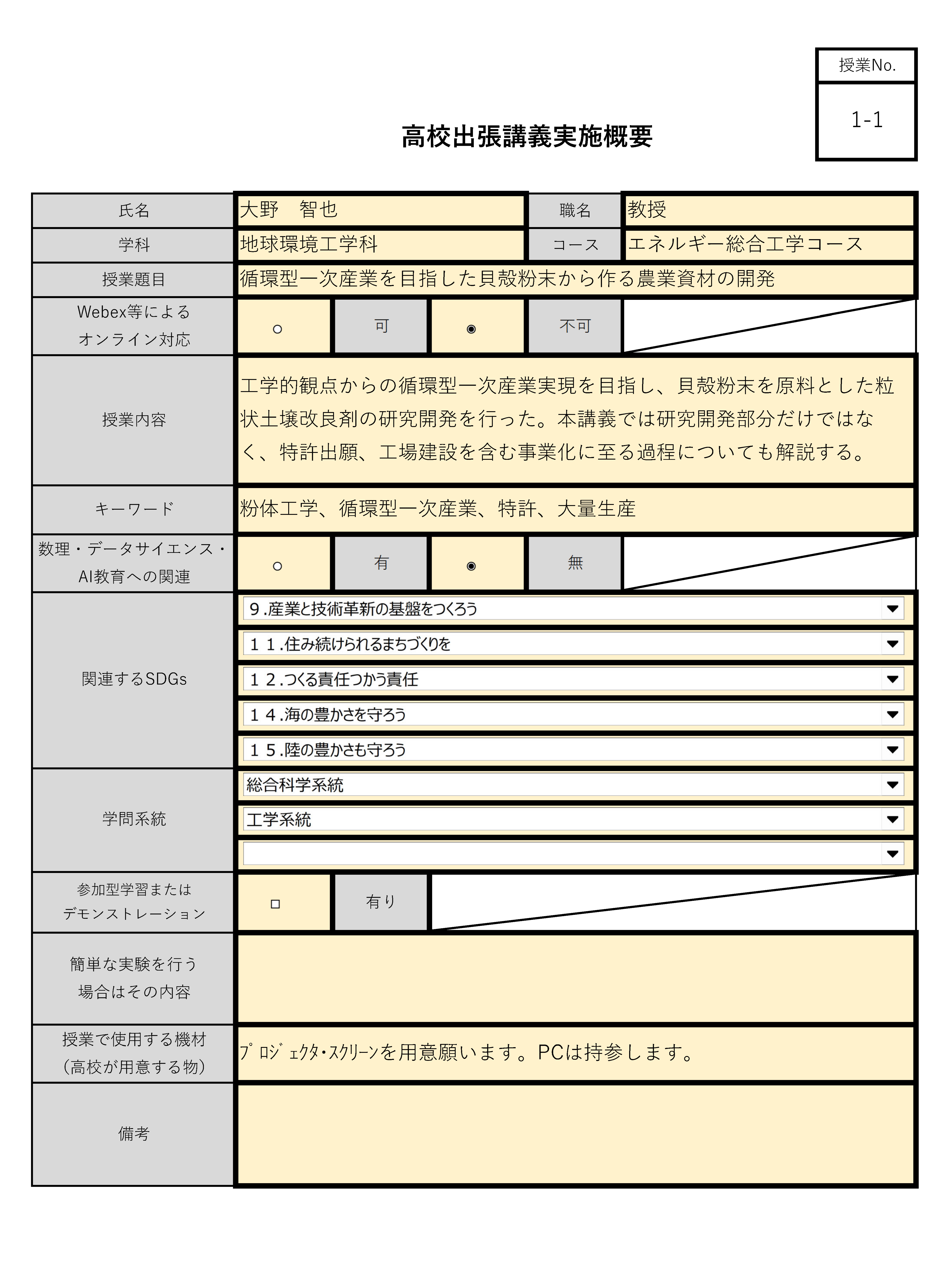 北見工業大学では、理工系分野の学問に興味を持ってもらうことを目的として、全国の高等学校を対象とした高校出張講義を実施しています。実施を希望する場合は、以下をご参照の上、「実施希望調書」をご送付ください。