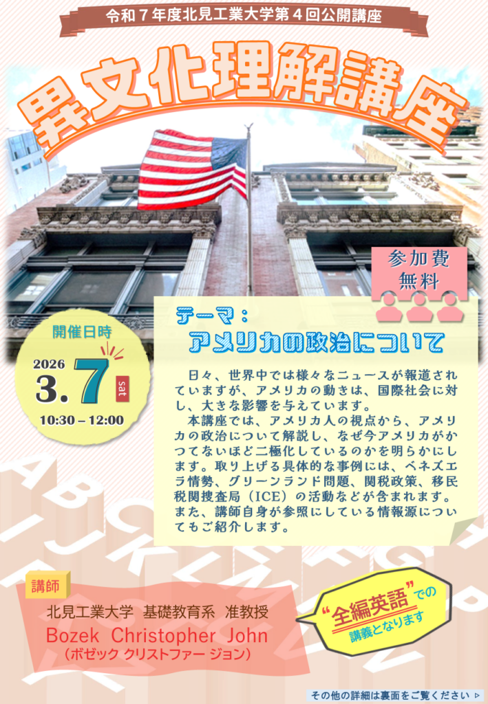 日々、世界中では様々なニュースが報道されていますが、アメリカの動きは、国際社会に対し、大きな影響を与えています。本講座では、アメリカ人の視点から、アメリカの政治について解説し、なぜ今アメリカがかつてないほど二極化しているのかを明らかにします。取り上げる具体的な事例には、ベネズエラ情勢、グリーンランド問題、関税政策、移民税関捜査局(ICE)の活動などが含まれます。また、講師自身が参照にしている情報源についてもご紹介します。