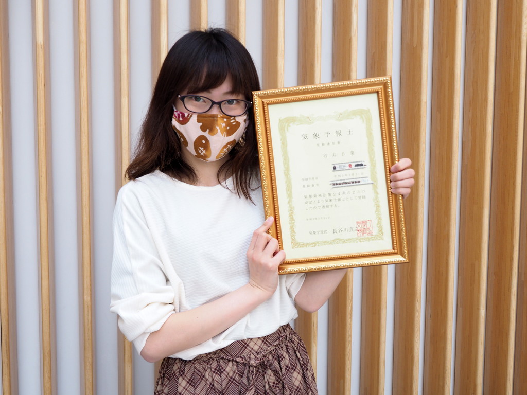 令和3年1月に実施された第55回気象予報士試験の合格者が先日発表され、本学地球環境工学科環境防災工学コース4年の石井日菜さんが見事合格、気象予報士として登録されました。