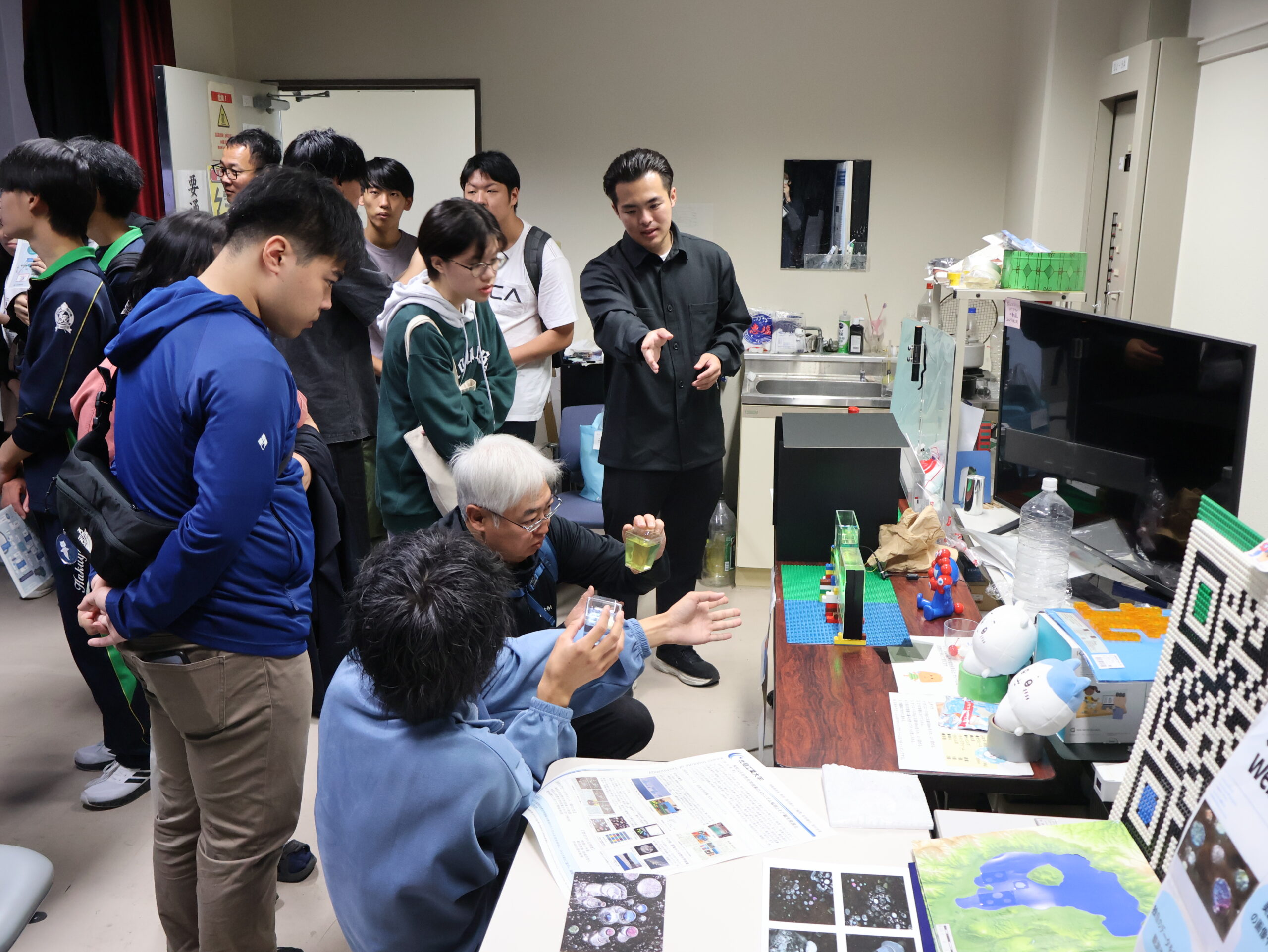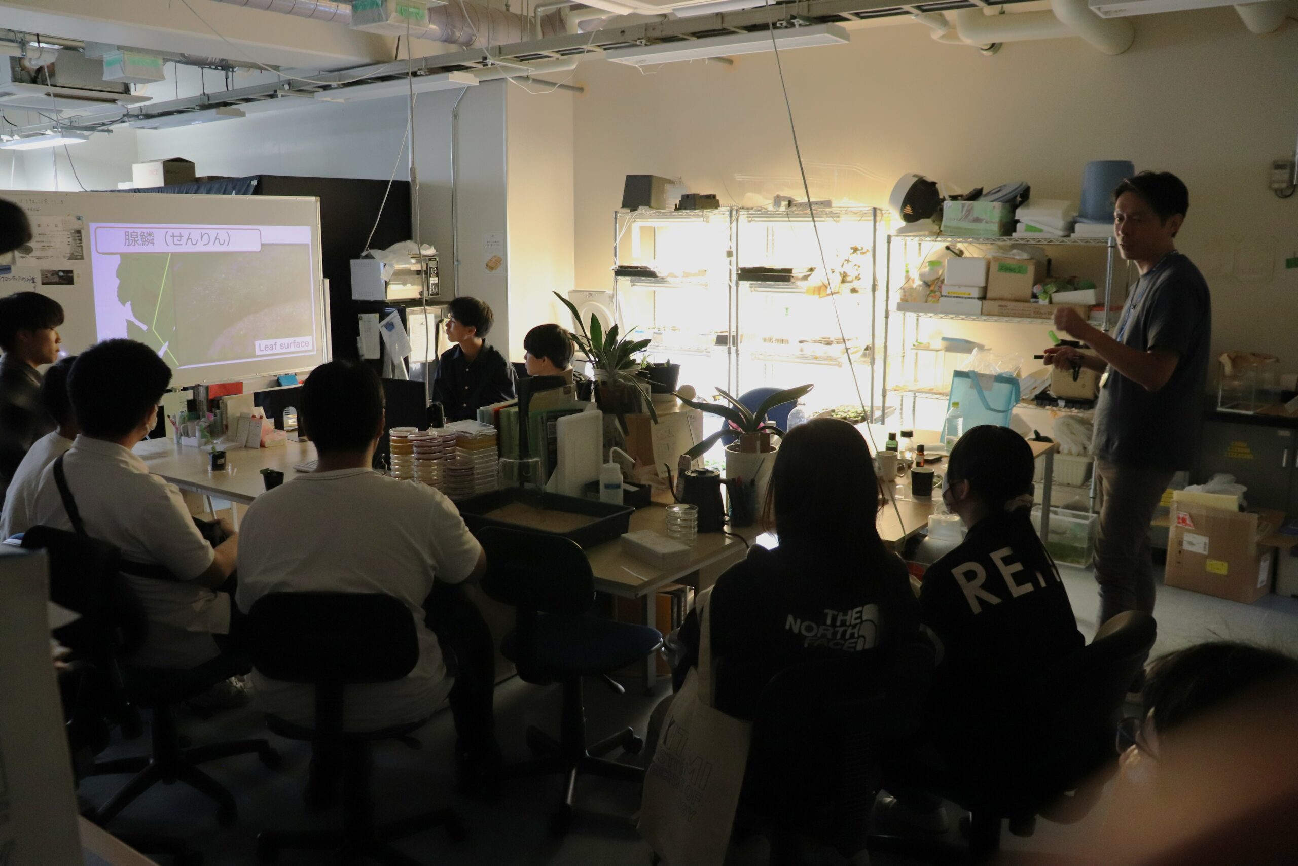 また同時間帯には、各研究室等において体験学習を実施しました。体験学習は、学部改組後に設置する9つのユニットから各1テーマをご用意し、高校生1人につき最大2テーマを事前に申し込んで参加するため、ご自身が興味のあるテーマについてじっくり学んでいただきました。