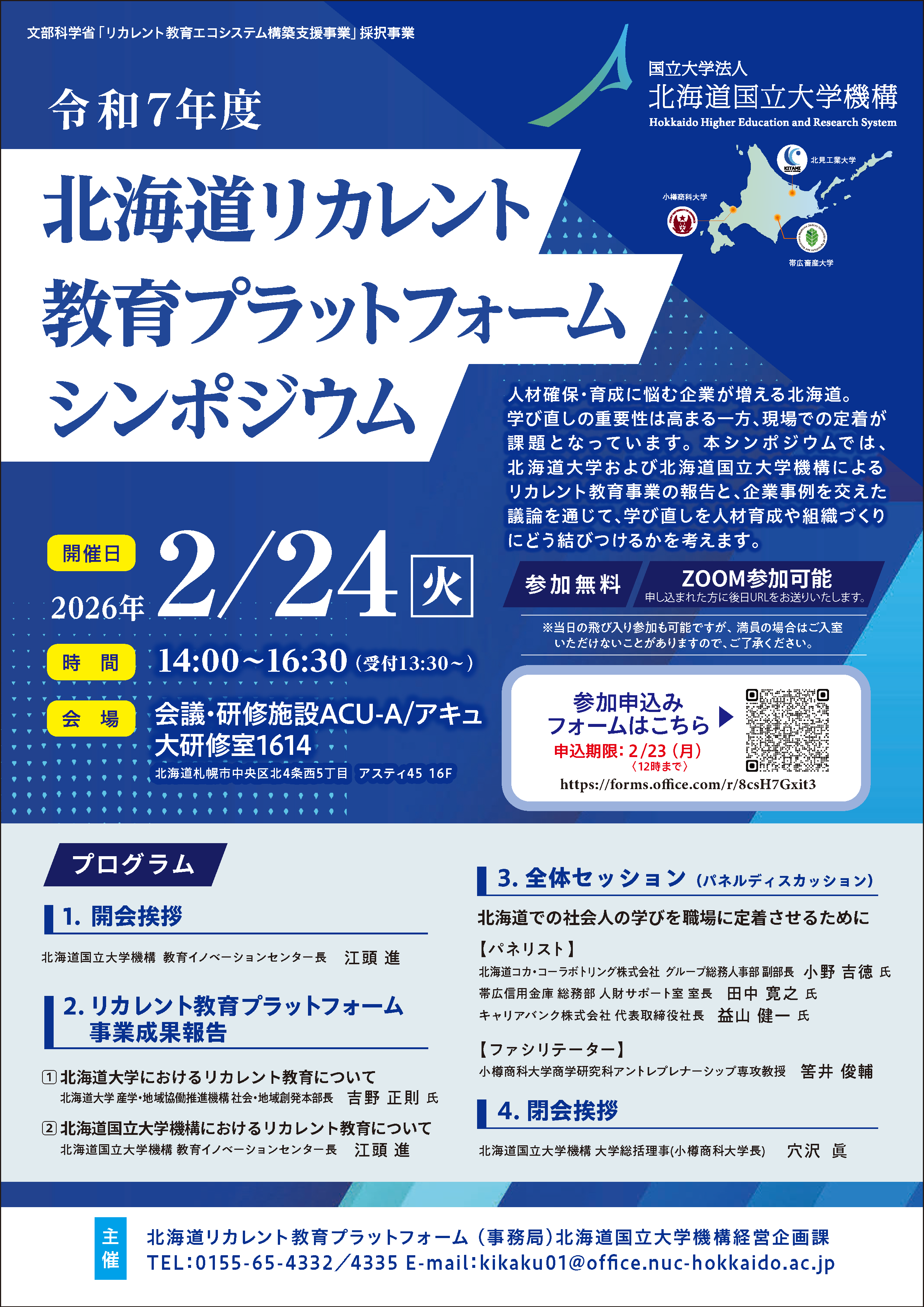 2月24日(火)、会議・研修施設ACU(札幌市)において、北海道リカレント教育プラットフォーム(事務局:北海道国立大学機構経営企画課)主催「令和7年度北海道リカレント教育プラットフォームシンポジウム」を開催します。