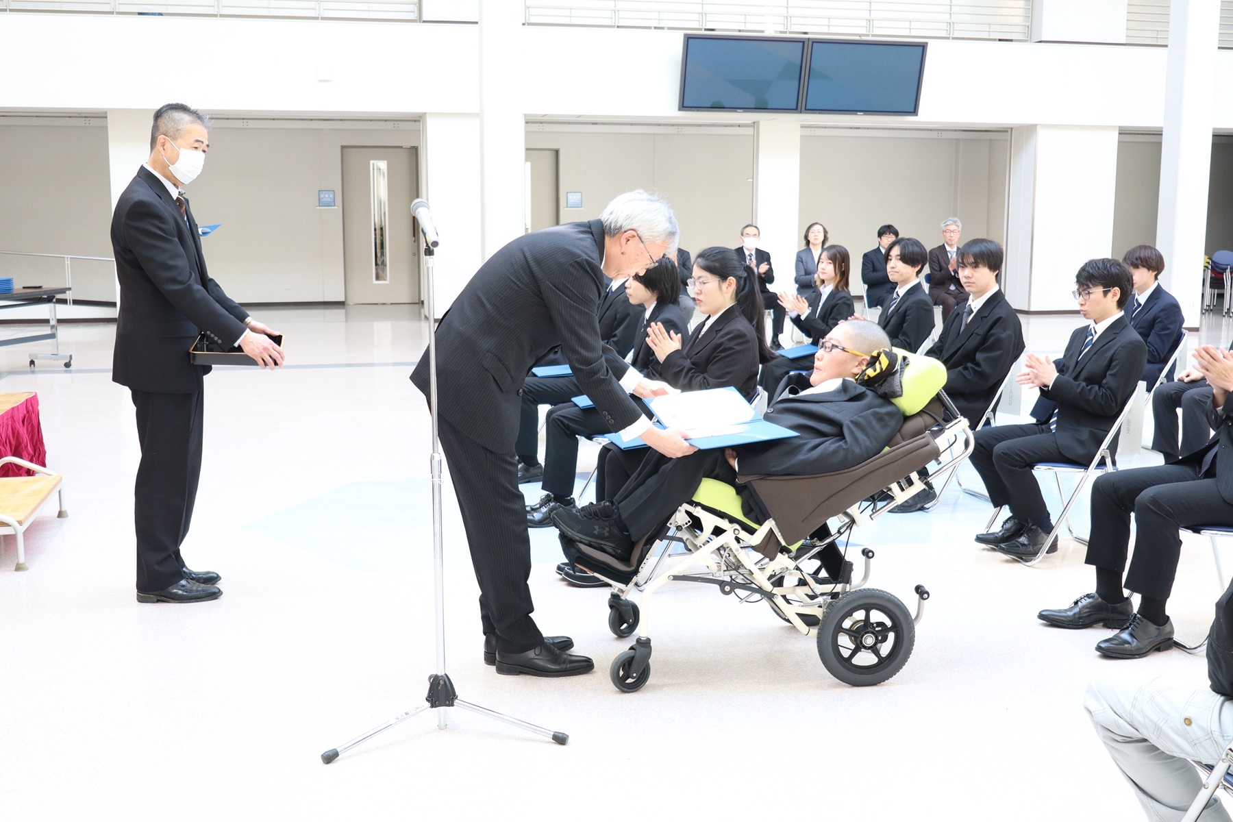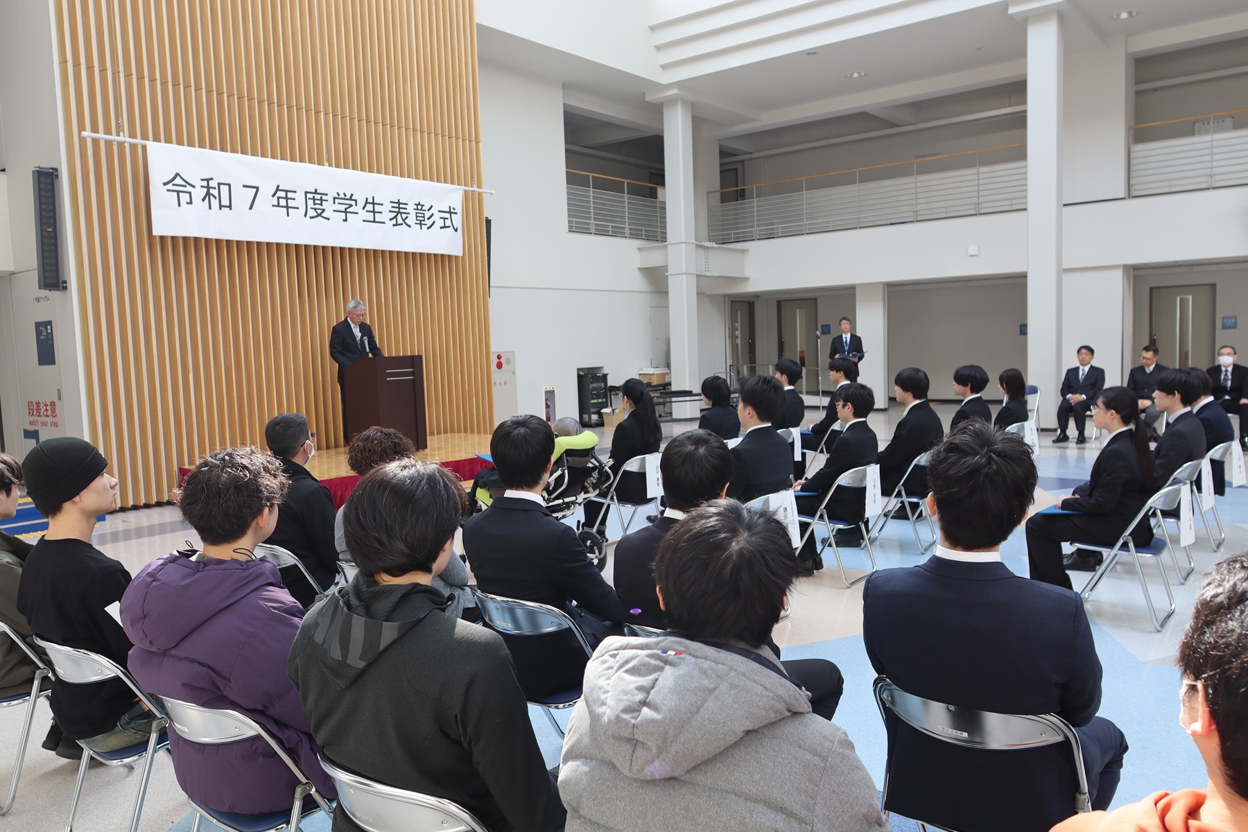 表彰式では、榮坂俊雄学長からお祝いの言葉と共に表彰状と記念品が贈呈され、表彰された学生たちは参列した教員や家族に見守られながら誇らしげに受け取っていました。