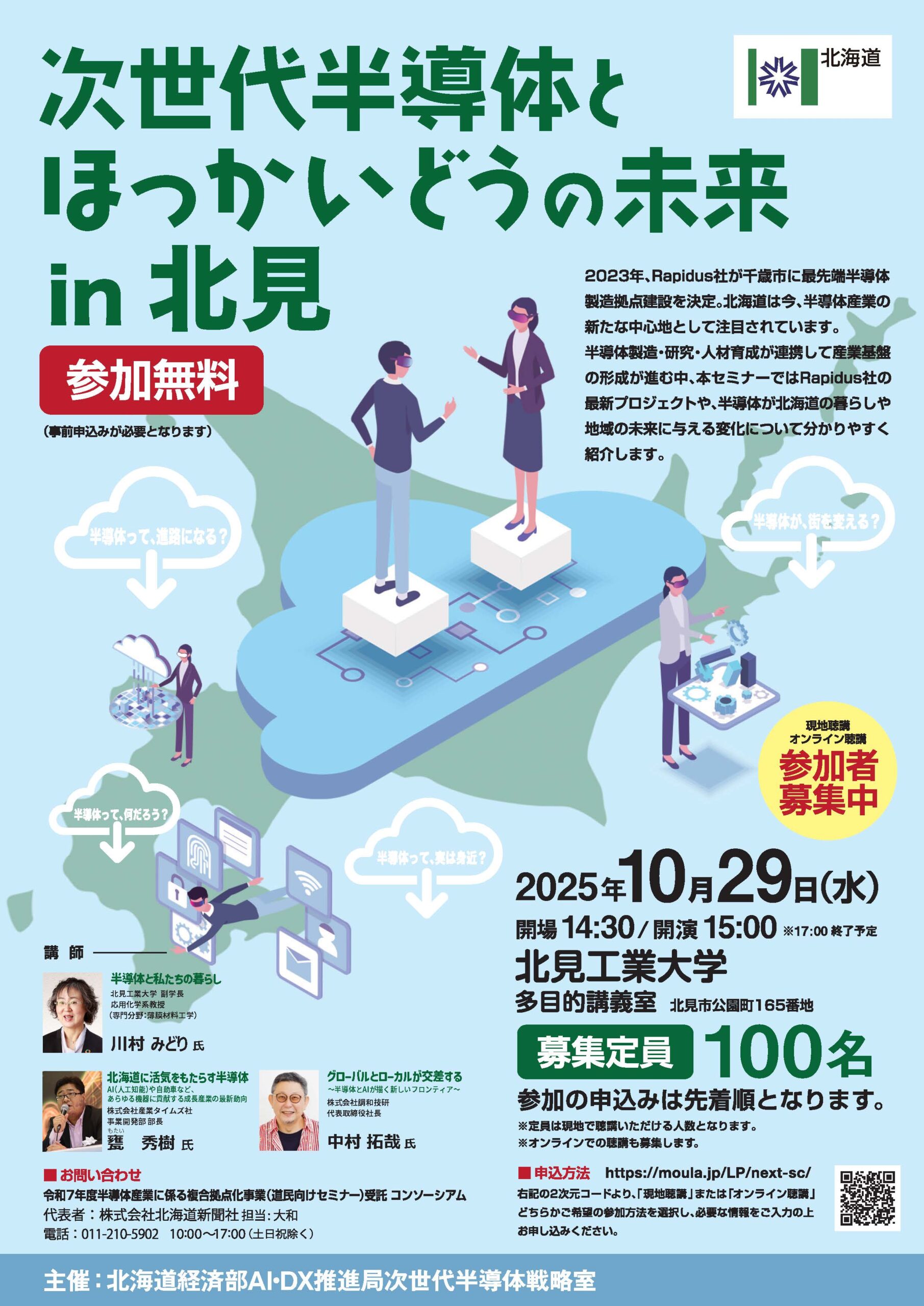 10月29日(水)15:00~、北見工業大学多目的講義室を会場として開催される、道民向けセミナー「次世代半導体とほっかいどうの未来 in 北見」(主催:北海道経済部AI・DX推進局次世代半導体戦略室)において、本学の川村みどり副学長・応用化学系教授(専門分野:薄膜材料工学)が講師として登壇し、「半導体と私たちの暮らし」について講演を行います。