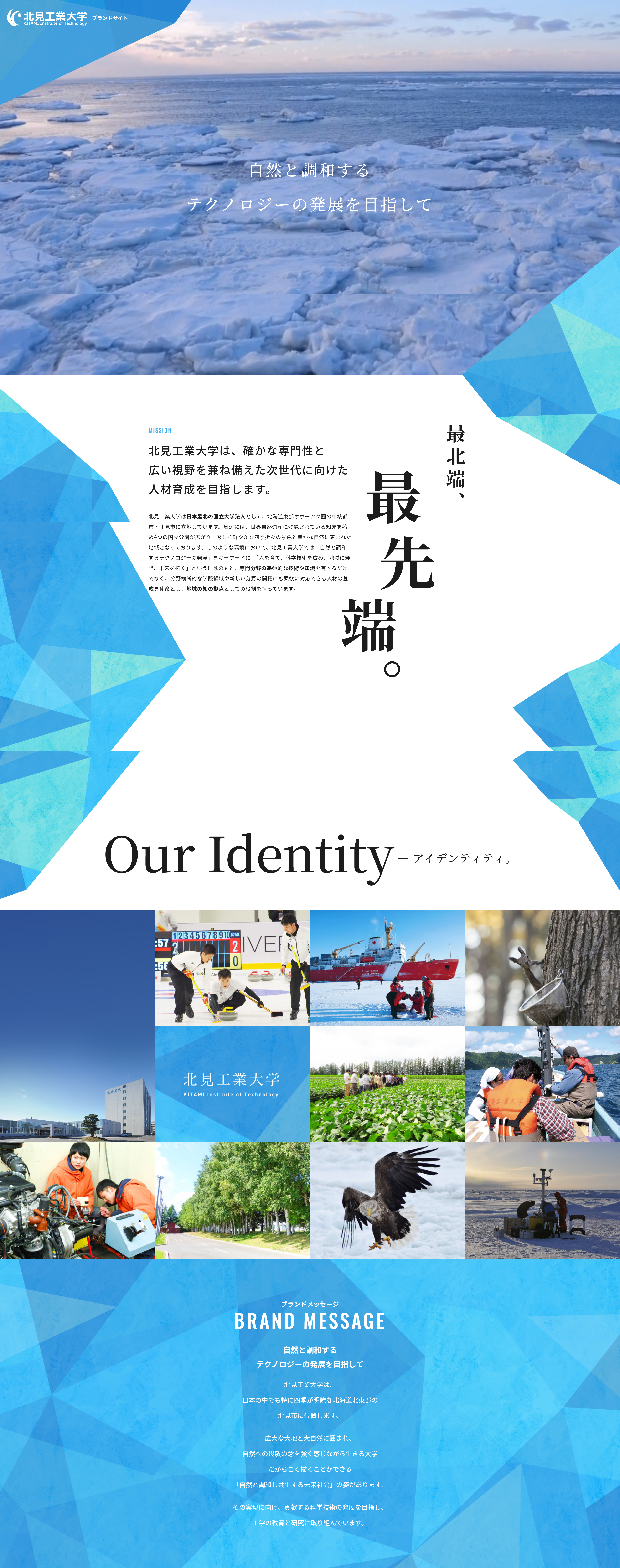「自然と調和するテクノロジーの発展を目指して」をブランドメッセージとして掲げ、国内最北の国立大学であり、広大な大地と大自然に囲まれ、自然への畏敬の念を強く感じながら生きる大学として、その特徴的なオホーツクの澄み渡った青空やオホーツク海に接岸する流氷をしメージした色彩やフレームを基調としたデザインを採用し、本学ならではの自然豊かな環境を生かした特徴的な研究内容について紹介しています。