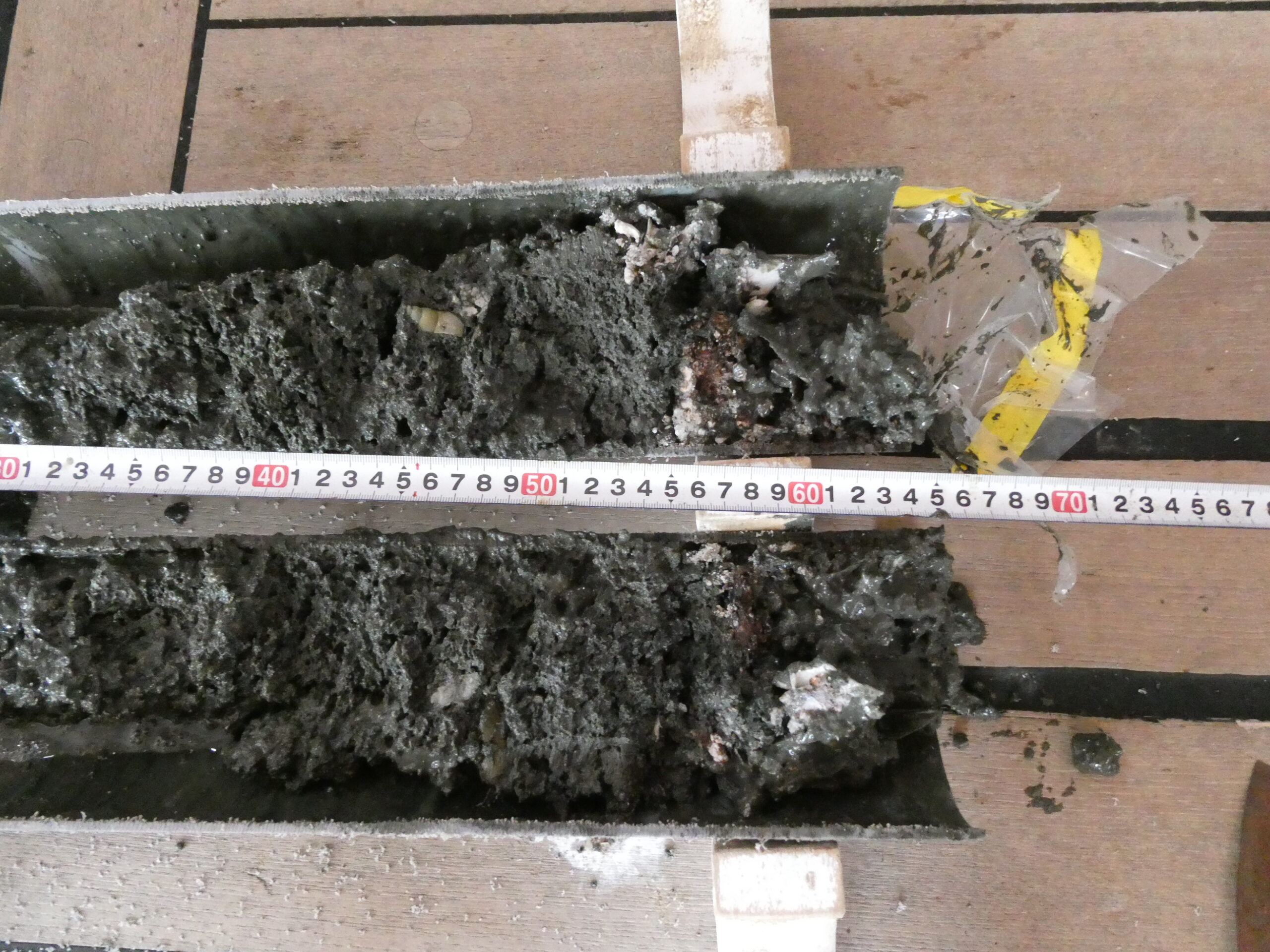 海底堆積物の採取は重力式コアラーによって行われ、5回行った採取のうちの2回でメタンハイドレート含有コアを採取することができました。