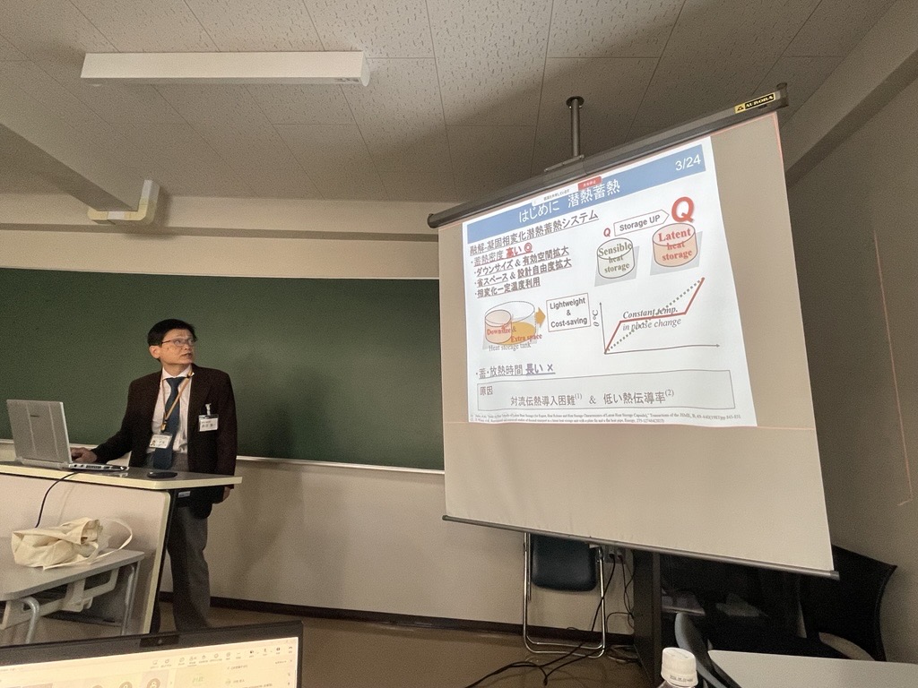 また、第2部では同系の森田慎一教授が「衝突噴流による融解潜熱蓄熱促進 潜熱蓄熱槽内の融解挙動~」と題して話題提供を行い、素早く融解熱を蓄える方法ついて解説しました。