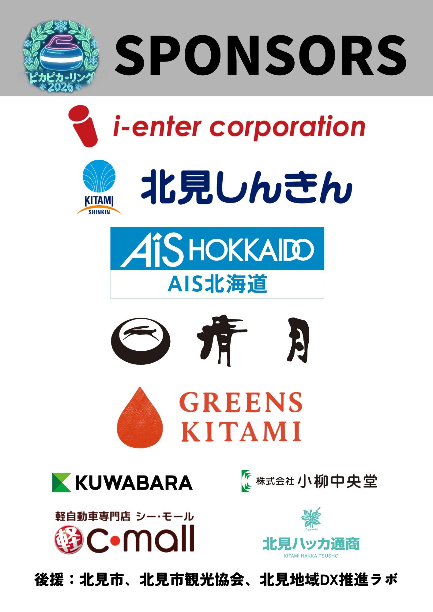 北見カーリング協会北見支部 / 一般社団法人 カーリング北見 / 特定非営利法人北見冬季スポーツ振興会 / ナベシマ工業株式会社 / 河西建設株式会社 / 一般社団法人 KiT CURLING CLUB / JR北海道北見駅 / 北海道北見バス株式会社 / 株式会社ネスト / 株式会社1st TAG / 志学会 / まやなぎ商店 / 花の店タマキ