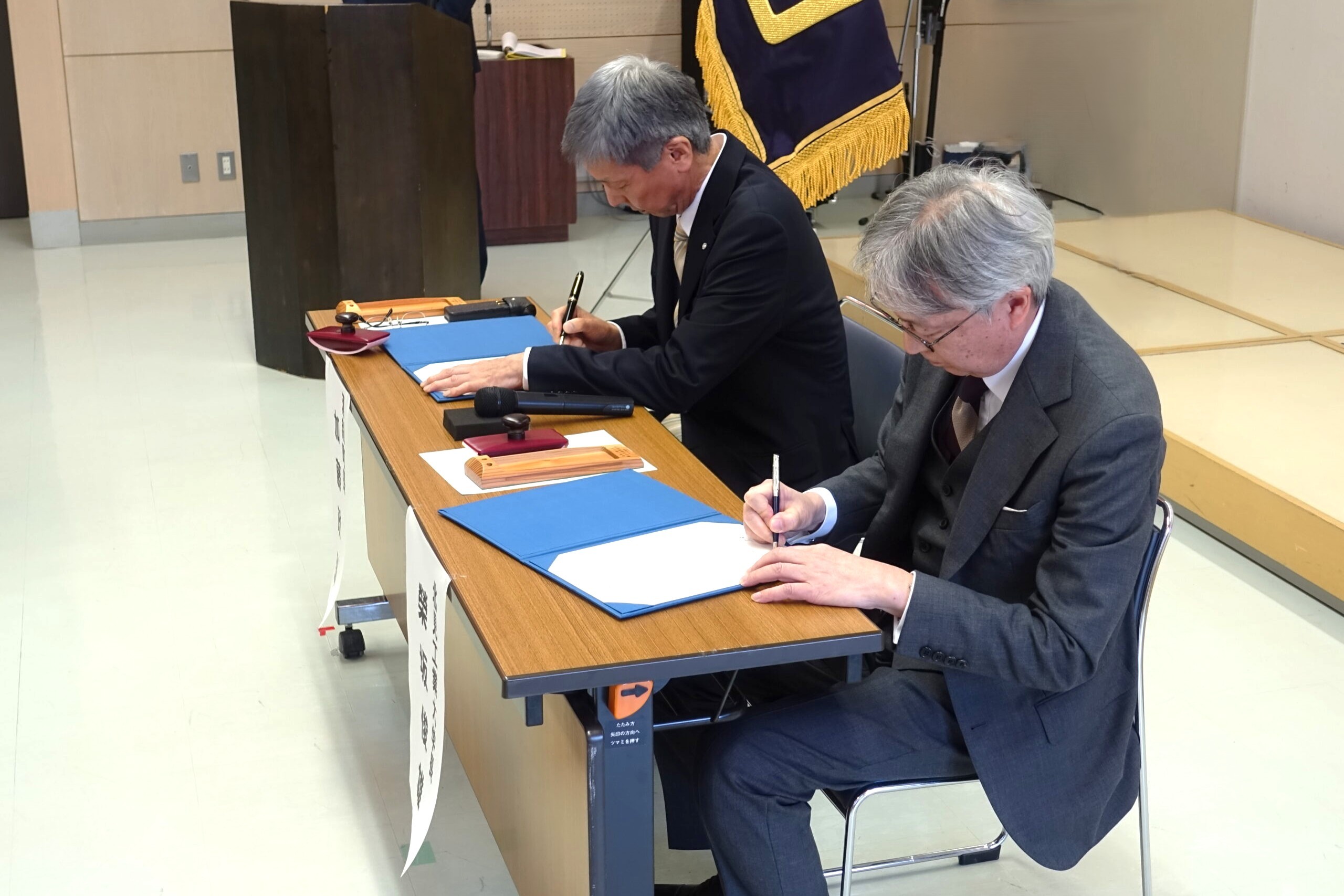 署名を行う加藤政弘町長と榮坂俊雄学長 (左から)協定書を手にする加藤町長と榮坂学長