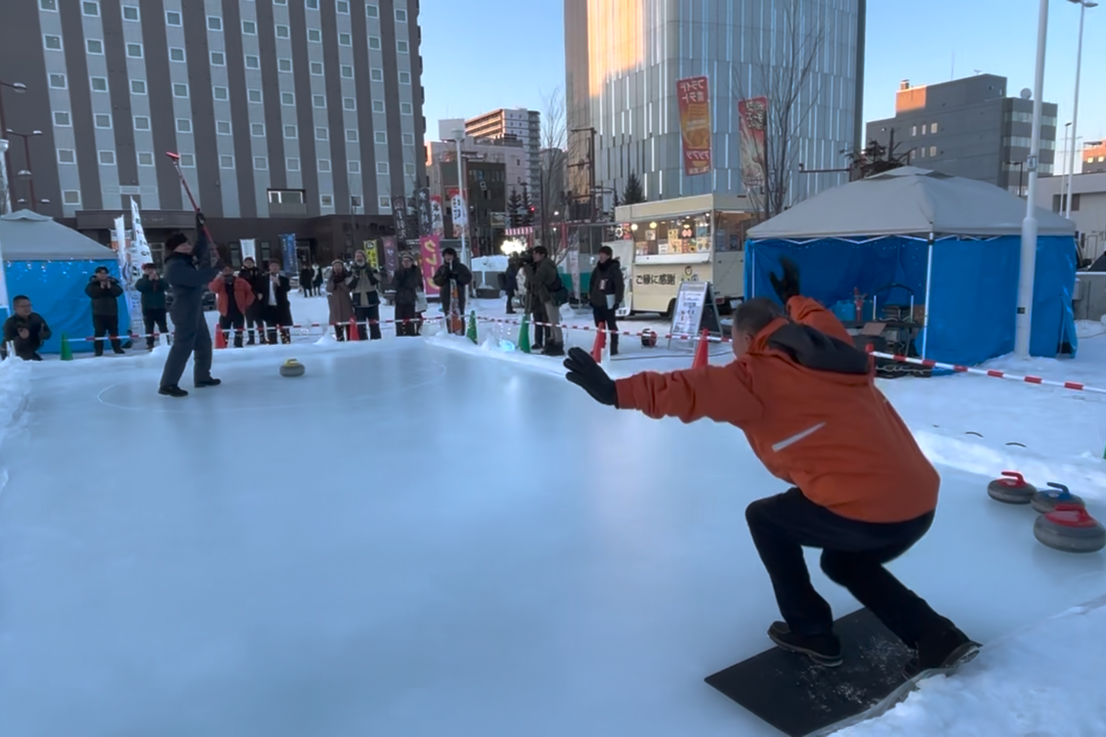 開催期間中は、駅やバスターミナルの利用客のほか家族連れなどでにぎわい、カーリング初体験の方もピカピカ光るリンクに向かって力いっぱいストーンを投げたり、併設するキッチンカーのグルメやVR映像体験を楽しんでいる様子が見られました。