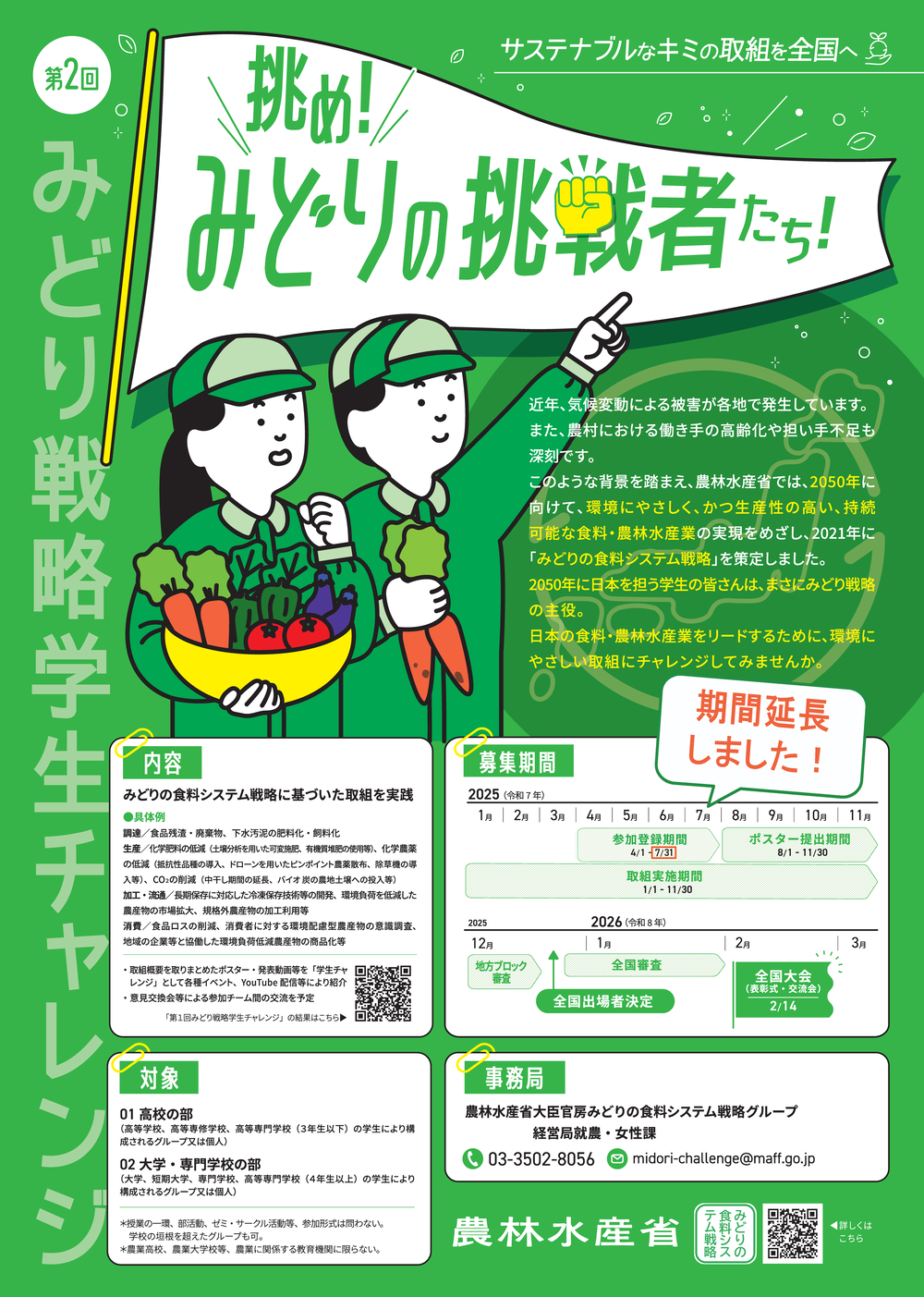 本大会は、「みどりの食料システム戦略」の実現に向けて、将来を担う若い世代の環境に配慮した取組を促すため、大学生や高校生等によるみどりの食料システム戦略に基づく取組を公募・表彰することを目的に開催されたものです。