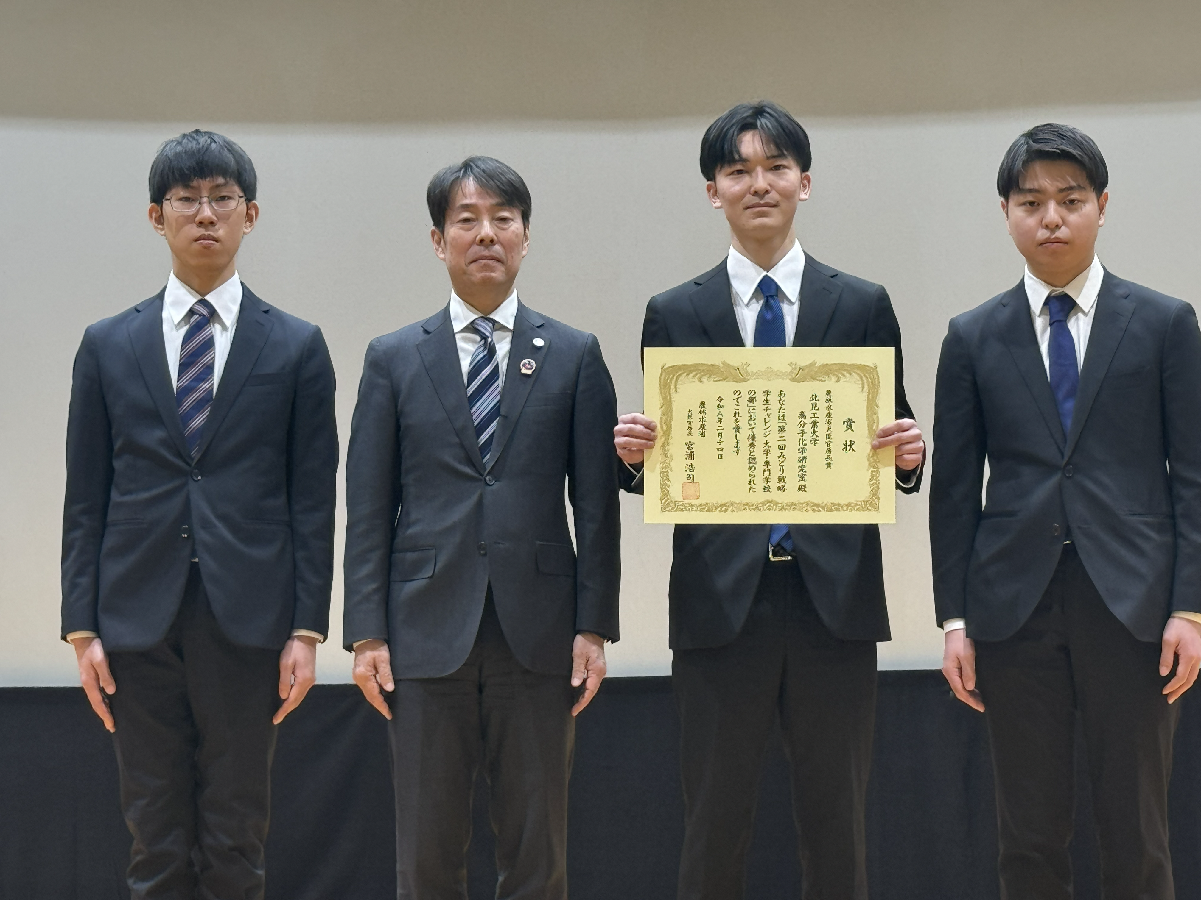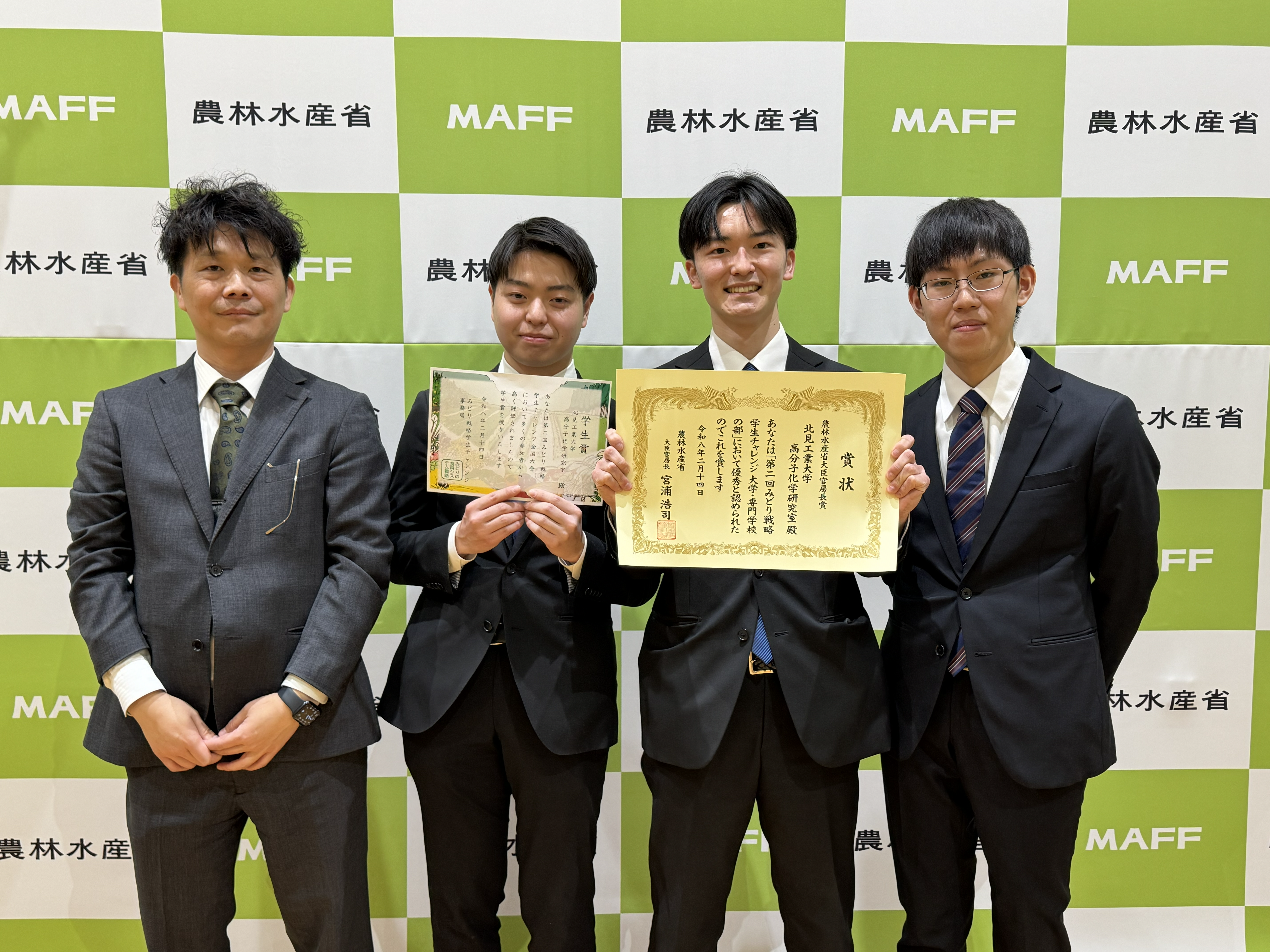 このたび、農林水産省主催「第2回みどり戦略学生チャレンジ(全国大会)」において、高分子化学研究室所属の学生3名が【大学・専門学校の部】の大臣官房長賞を受賞しました。(農林水産省による受賞者発表はこちら)