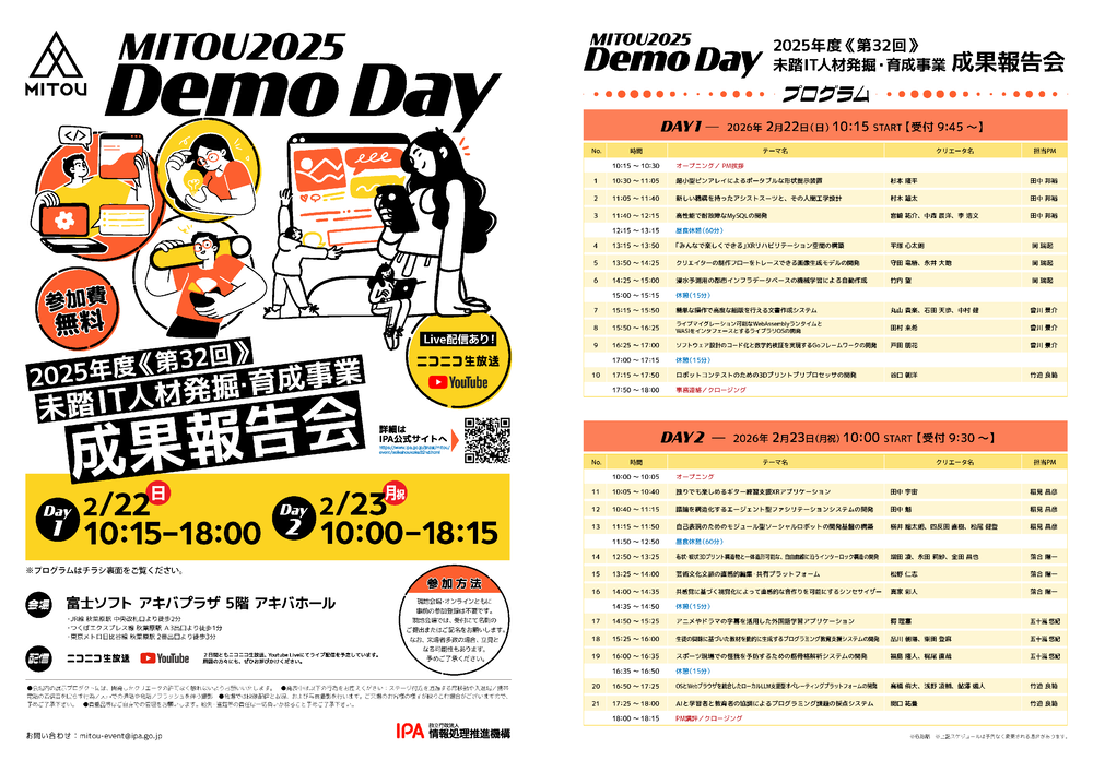 2月22日(日)・23日(月)、富士ソフトアキバプラザ(東京都千代田区)で開催される「MITOU2025 Demo Day/第32回 未踏IT人材発掘・育成事業 成果報告会」において、各プロジェクトの成果報告が行われます。