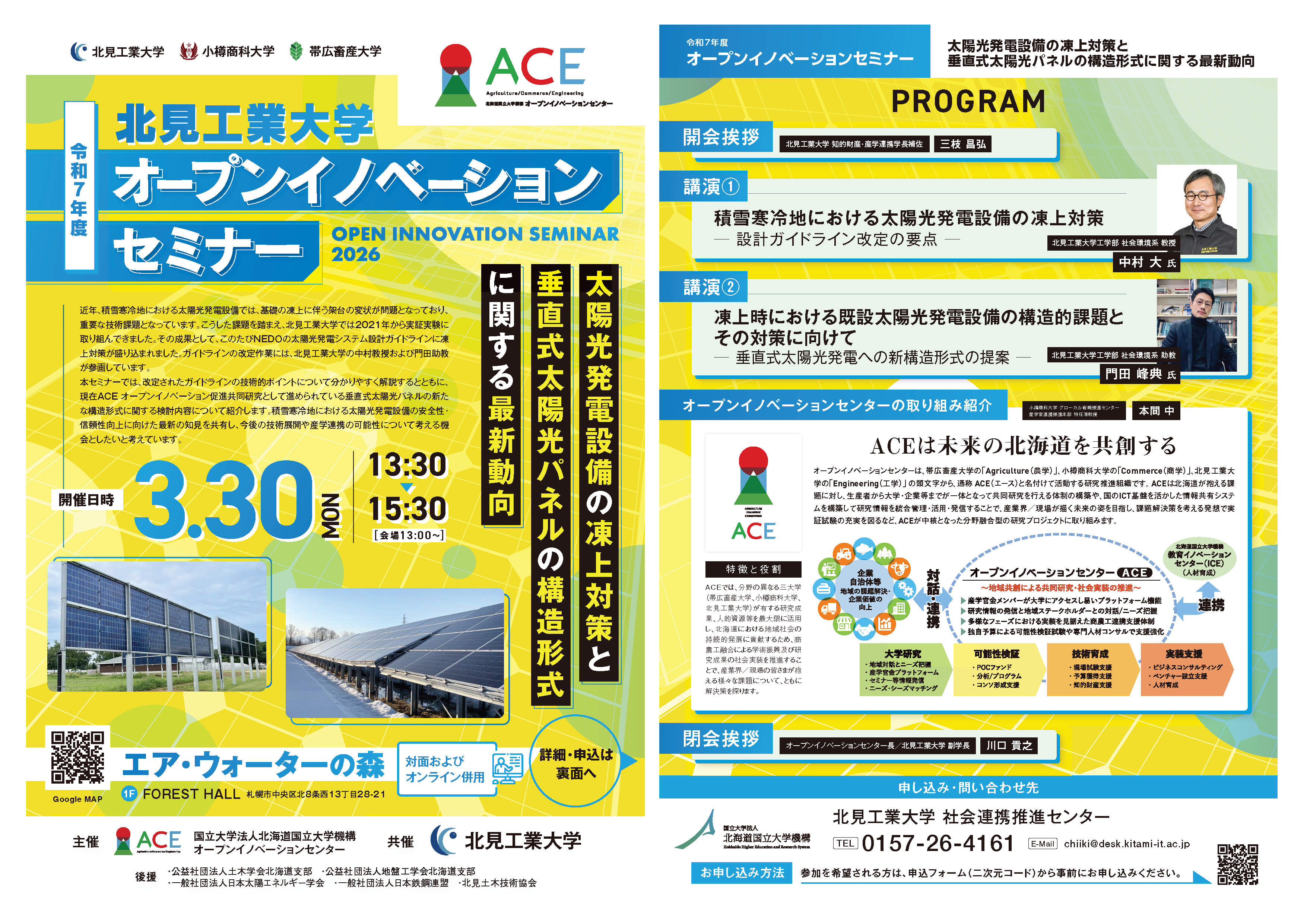 このたび、北海道国立大学機構オープンイノベーションセンター(通称:ACE)では、令和7年度オープンイノベーションセミナー 「太陽光発電設備の凍上対策と垂直式太陽光パネルの構造形式に関する最新動向」を開催します。本セミナーは、札幌市の会場での様子をオンラインで同時配信するハイブリッド開催となります。