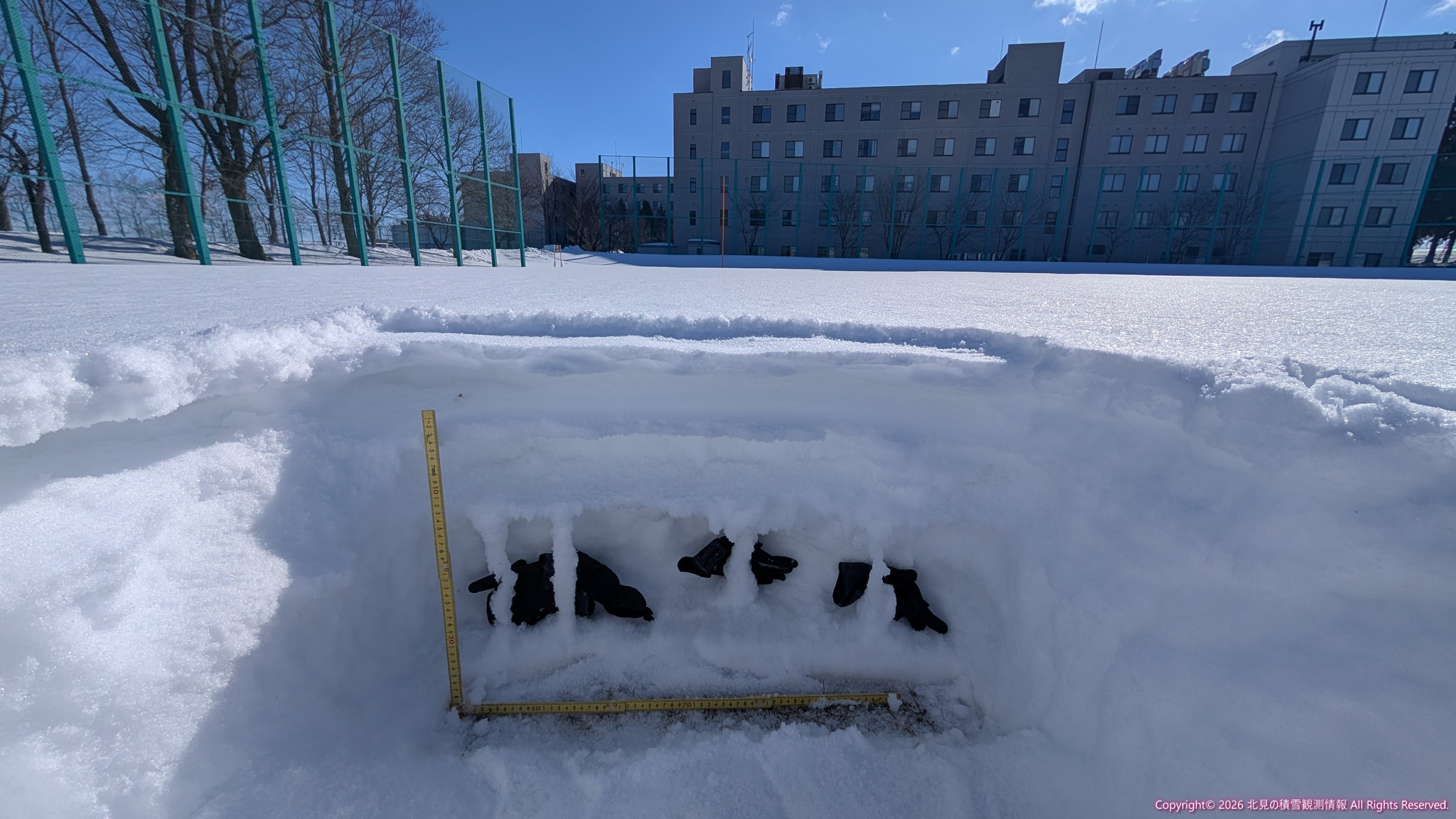 調査項目は、積雪の高さ、簡易層構造および積雪水量の3項目で、全ての調査地点で平均的な堆積状況を調査した後に雪面から地面までピットを掘削し、 積雪観測ガイドブック(公益社団法人 日本雪氷学会、2010年発行)の手順に準じた方法で記録しています。