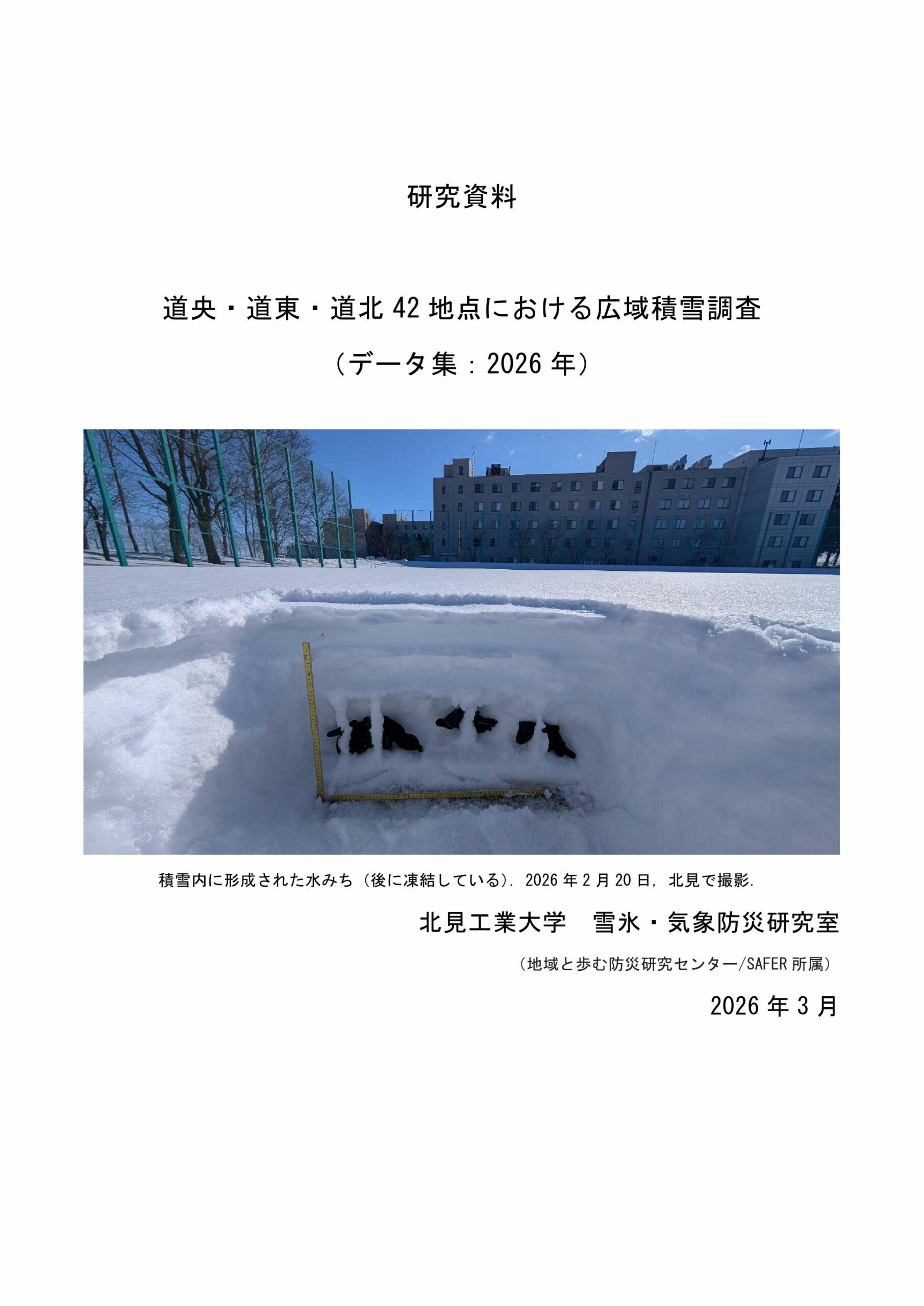 2026年2月16日(月)~3月5日(木)の期間、地域と歩む防災研究センター(SAFER)突発災害調査研究部門の白川龍生准教授が、北海道内42地点において広域積雪調査を実施しました。これは2014年より毎年実施している調査で、融雪出水期(2月下旬~3月上旬)の直前における北海道内各地の積雪状態を把握するものです。