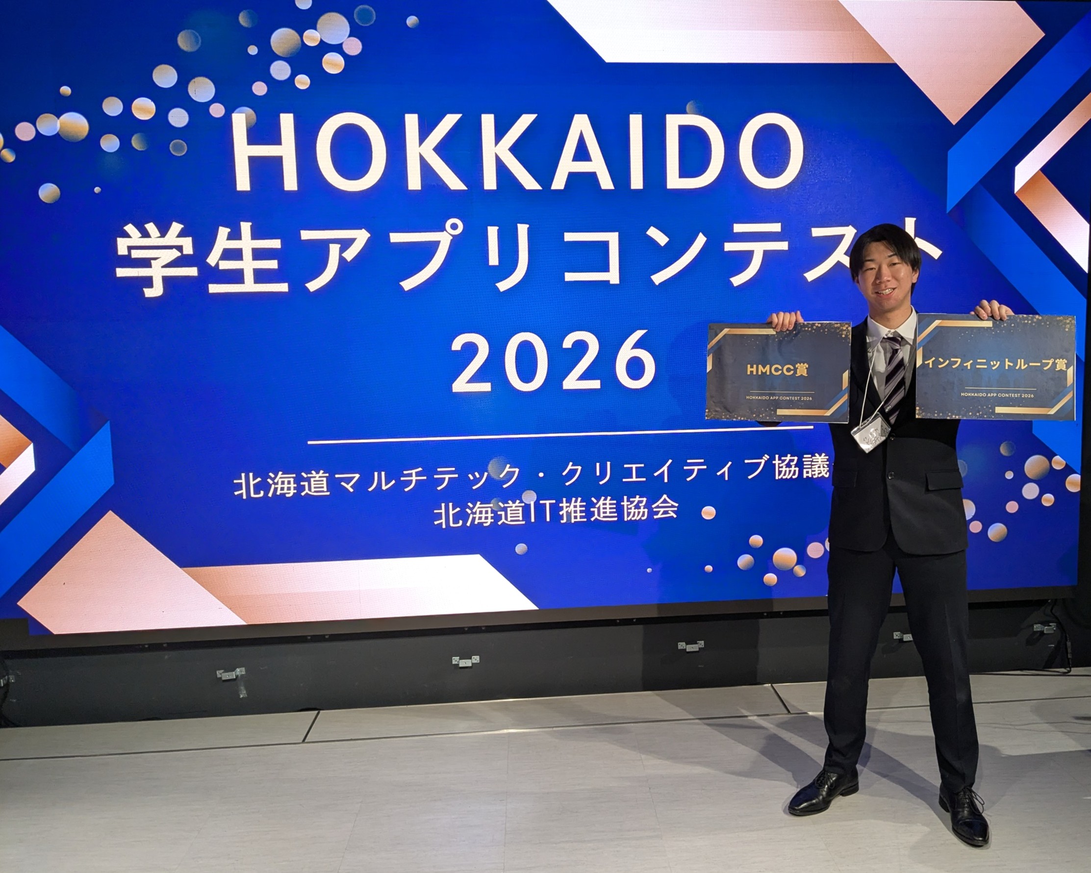 このたび、一般社団法人北海道モバイルコンテンツ・ビジネス協議会主催「HOKKAIDO学生アプリコンテスト2026」において、本学大学院生の稲井大起さん(受賞当時:博士前期課程 工学専攻 情報通信工学プログラム1年、主指導教員:酒井大輔准教授)が、HMCC賞とインフィニットループ賞をW受賞しました。